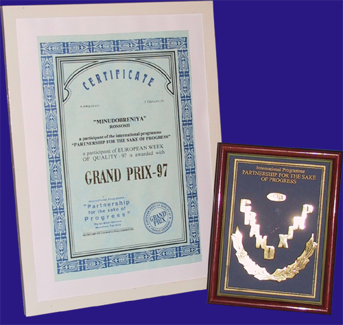 Предприятие было удостоено GRAND PRIX-97 за участие в международном конкурсе «Партнерство во имя прогресса» (Рим, Италия) в рамках программы «Европейская Неделя Качества-97». |