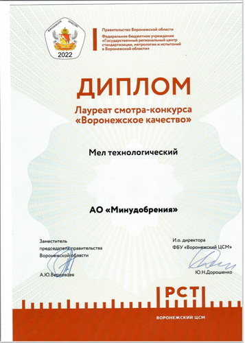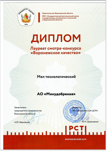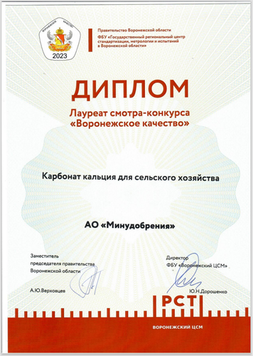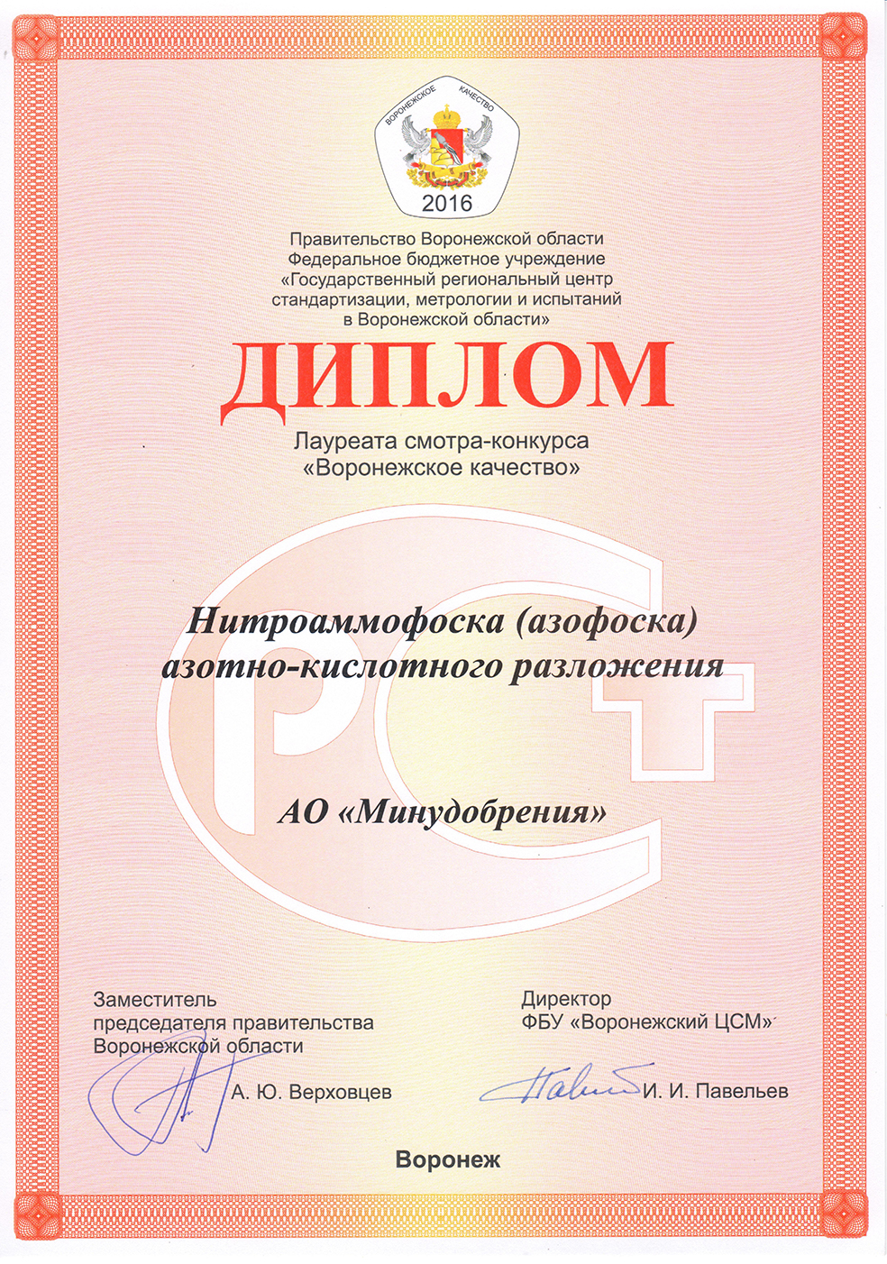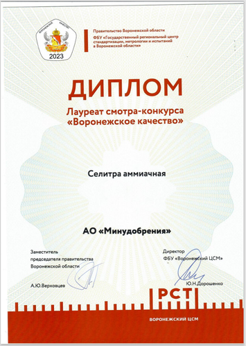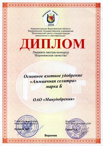 Аммиак жидкий технический, аммиачная селитра, нитроаммофоска азотно-кислотного разложения и мел технологический признаны лауреатами и получили дипломы «Воронежское качество» в номинации «Продукция производственно-технического назначения». |