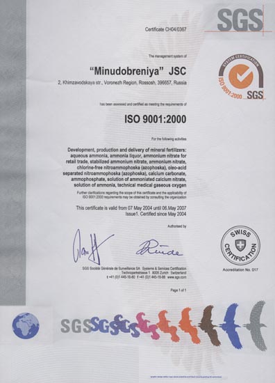 В мае 2004 года международным сертификационным органом SGS (Швейцария) нашему предприятию выдан Международный сертификат соответствия системы менеджмента качества требованиям стандарта ИСО 9001-2000. |