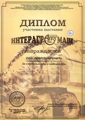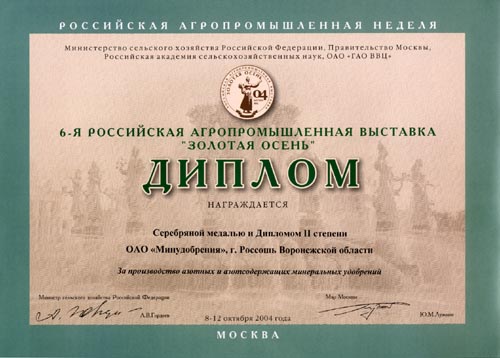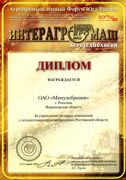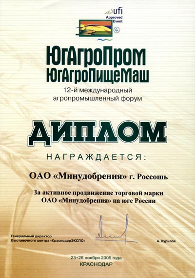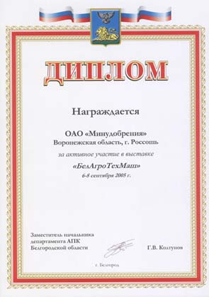 Почетный диплом участника вручен ОАО «Минудобрения» на проходившей с 6 по 8 сентября 2005 года выставке «БелАгроТехМаш» в Белгороде. |