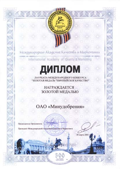 30 марта на конкурсе «Золотая медаль» Европейское качество" ОАО «Минудобрения» г.Россошь было награждено золотой медалью «Европейское качество» и дипломом лауреата. |