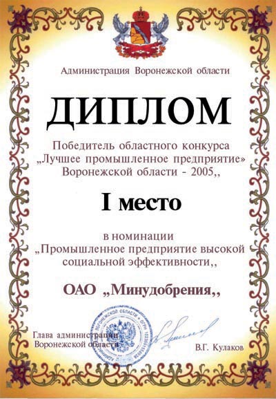 ОАО «Минудобрения» на областном конкурсе «Лучшее промышленное предприятие Воронежской области 2005» удостоено первого места в номинациях «Промышленное предприятие высокой социальной эффективности» и «Нефтехимическая промышленность». |
