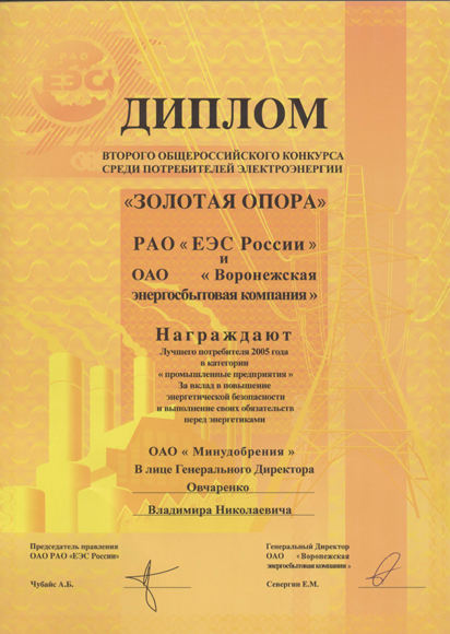 РАО «ЕЭС России» и ОАО «Воронежская энергосбытовая компания» удостоили ОАО «Минудлобрения» приза «Золотая опора» за вклад в повышение энергетической безопасности и выполнение своих обязательств перед энергетиками. |