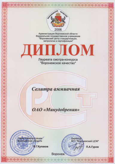 Селитра аммиачная, нитроаммофоска (азофоска) азотно-кислотного разложения 1:1:1 и 2:1:1, аммиак жидкий технический – стали лауреатами смотра – конкурса «Воронежское качество-2006». |