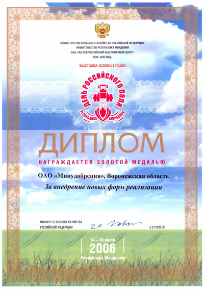 На ежегодной агропромышленной выставке в Москве ОАО «Минудобрения» удостоено Диплома I-й степени «За производство минеральных удобрений» и золотой медали Министерства сельского хозяйства РФ. |
