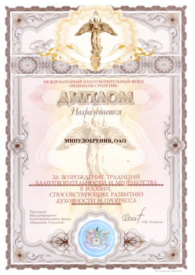 Международный благотворительный фонд «Меценаты столетия» наградил ОАО «Минудобрения» дипломом «За возрождение традиций благотворительности и меценатства в России, способствующих развитию духовности и прогресса». |