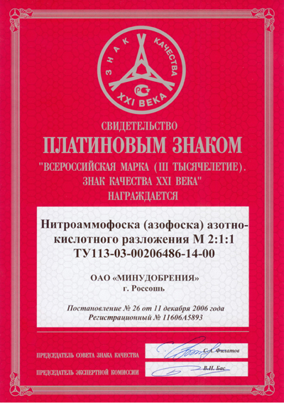 На заключительном этапе конкурса (2004-2006 г.г.) «Всероссийская марка (III тысячелетие). Знак качества XXI века» четыре продукта россошанского комбината аммиак жидкий технический, селитра аммиачная, нитроаммофоска (азофоска) азотно-кислотного разложения М 1:1:1 и 2:1:1 получили почетные Платиновые Знаки. |