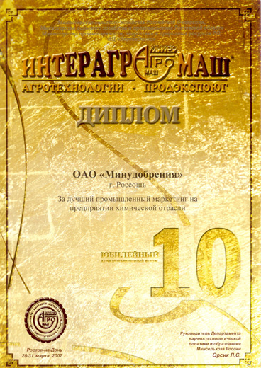 За производство и продвижение на рынок России новых видов высокоэффективных марок минеральных удобрений ОАО «Минудобрения» было удостоено золотой медали на выставке «Интерагромаш» в г. Ростов-на-Дону, а также диплома за лучший промышленный маркетинг на предприятии химической отрасли. |