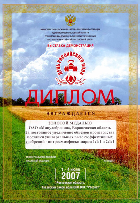 За постоянное увеличение объемов производства и поставок универсального высокоэффективного удобрения нитроаммофоски марок 1:1:1 и 2:1:1 предприятию вручены диплом и Золотая медаль IV Всероссийского Дня поля, проходившего 1-4 июля в пос. Рассвет, Ростовской области. |