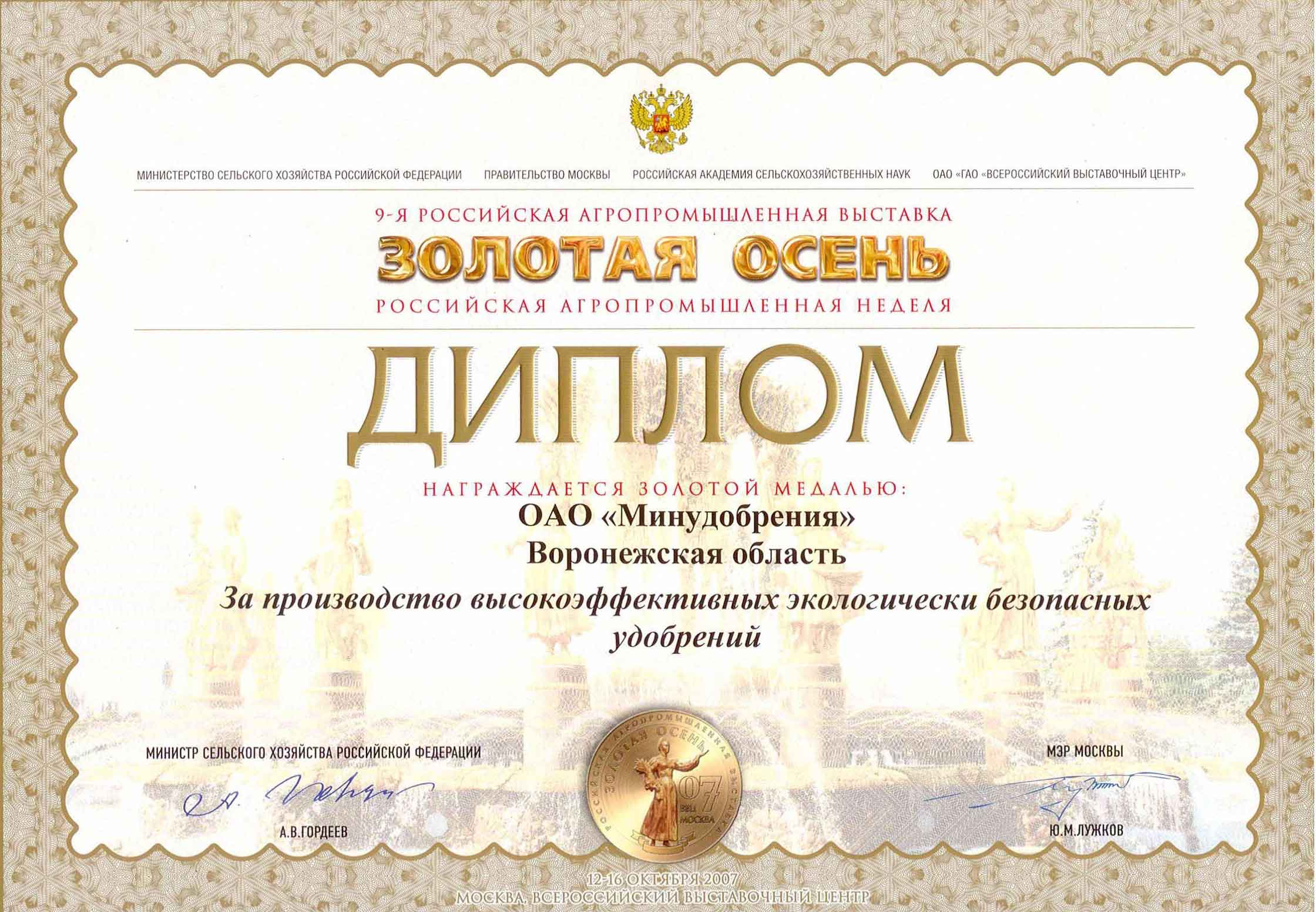 Золотая медаль и Диплом Всероссийской агропромышленной выставки «Золотая осень-2007» в конкурсе «За производство высокоэффективных экологически безопасных удобрений» за традиционные азофоску и аммиачную селитру, а также новую продукцию – высокоазотистые марки нитроаммофоски. |