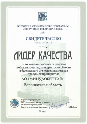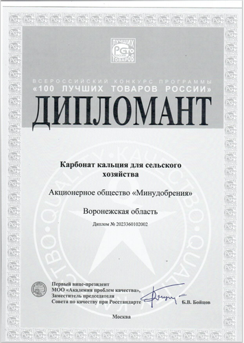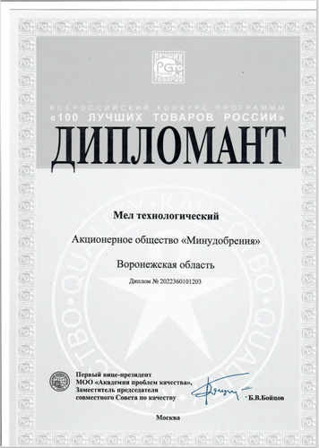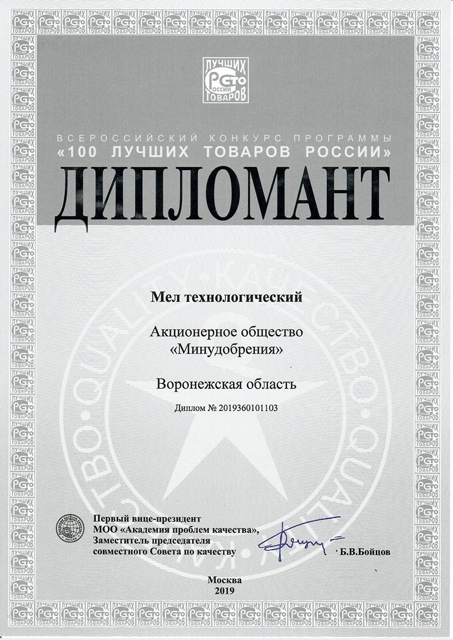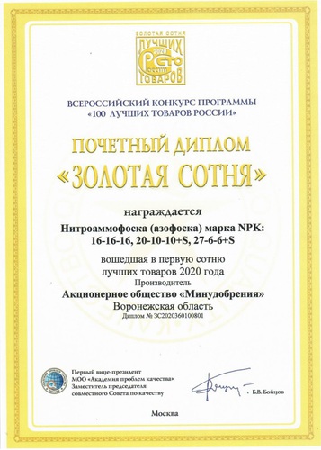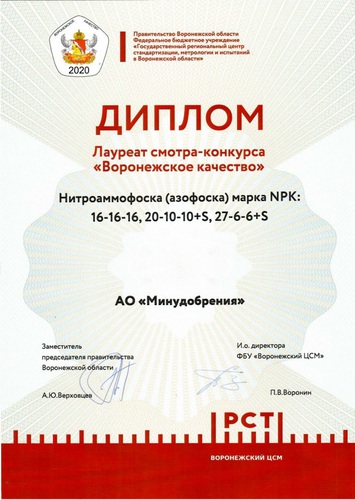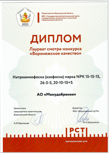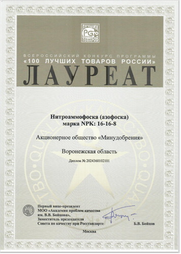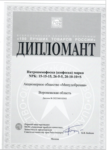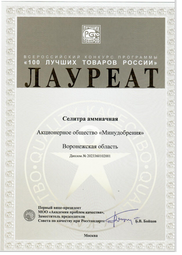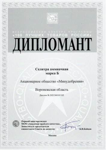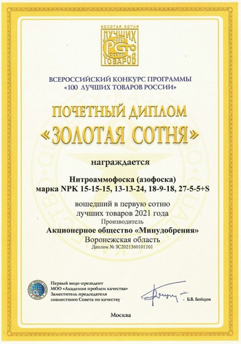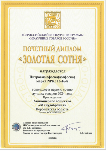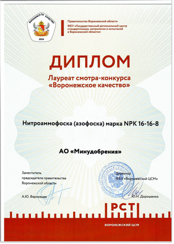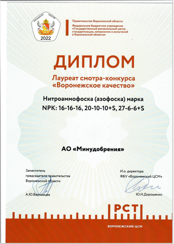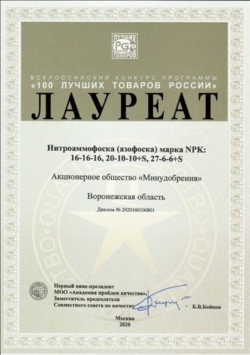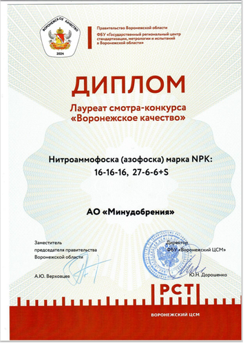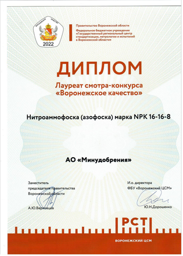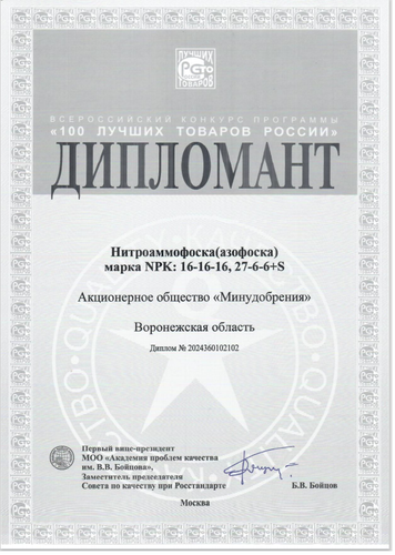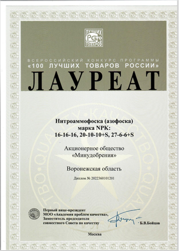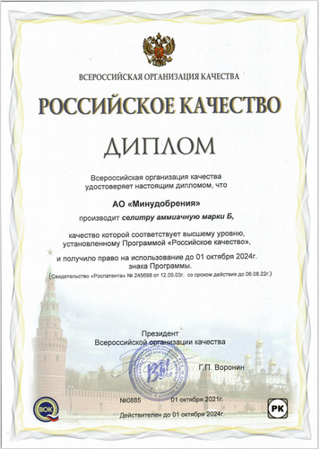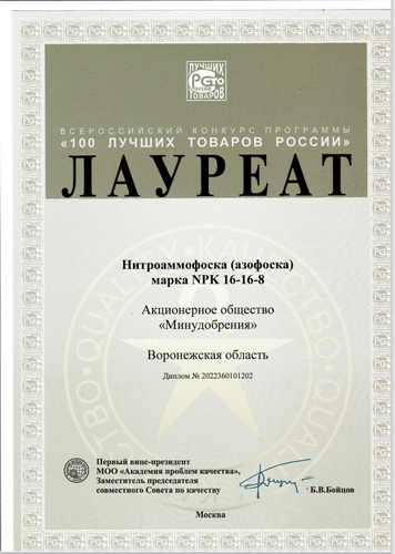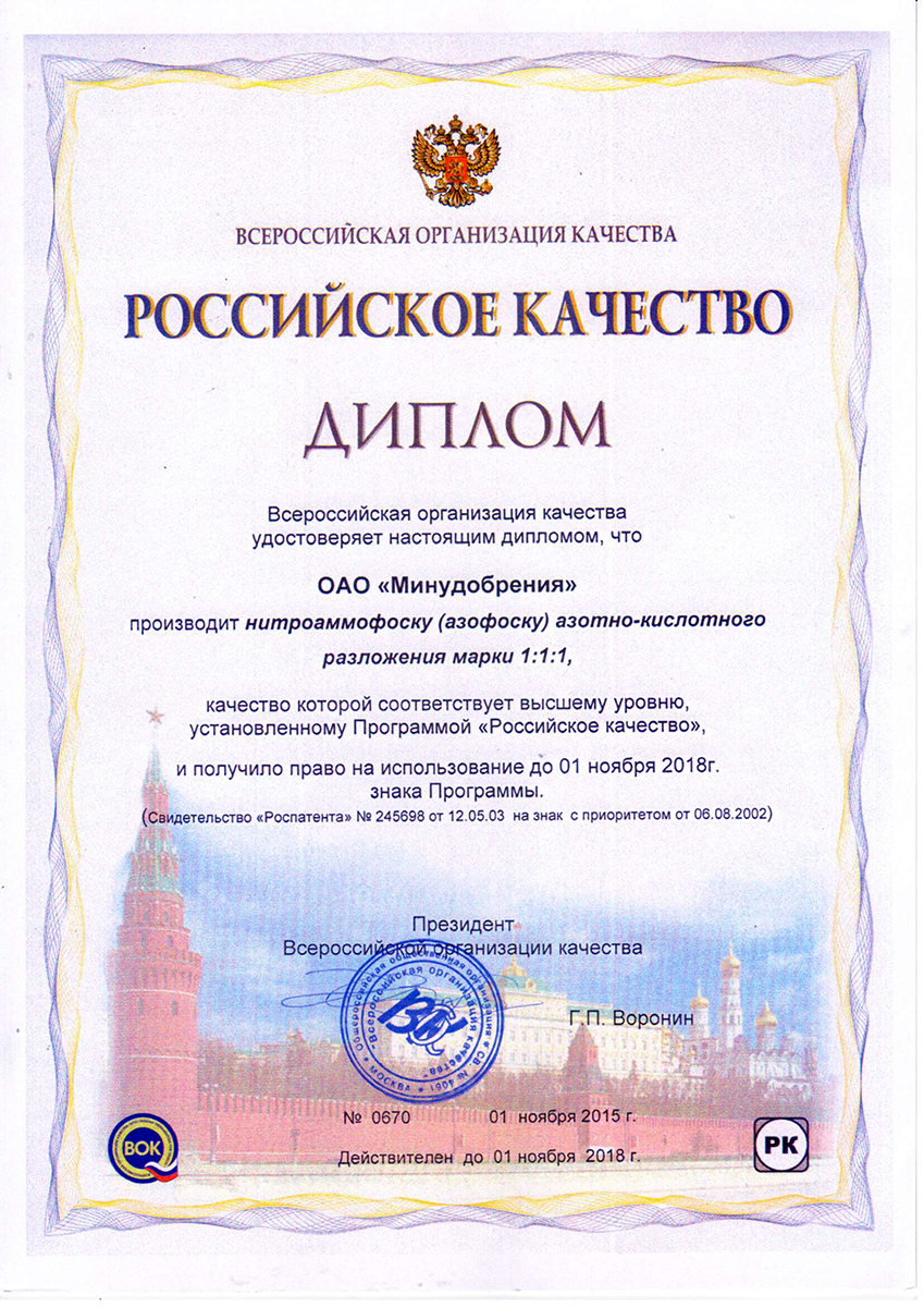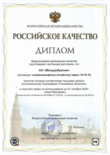 Всероссийская организация качества удостоверяет настоящим дипломом, что АО «Минудобрения» производит