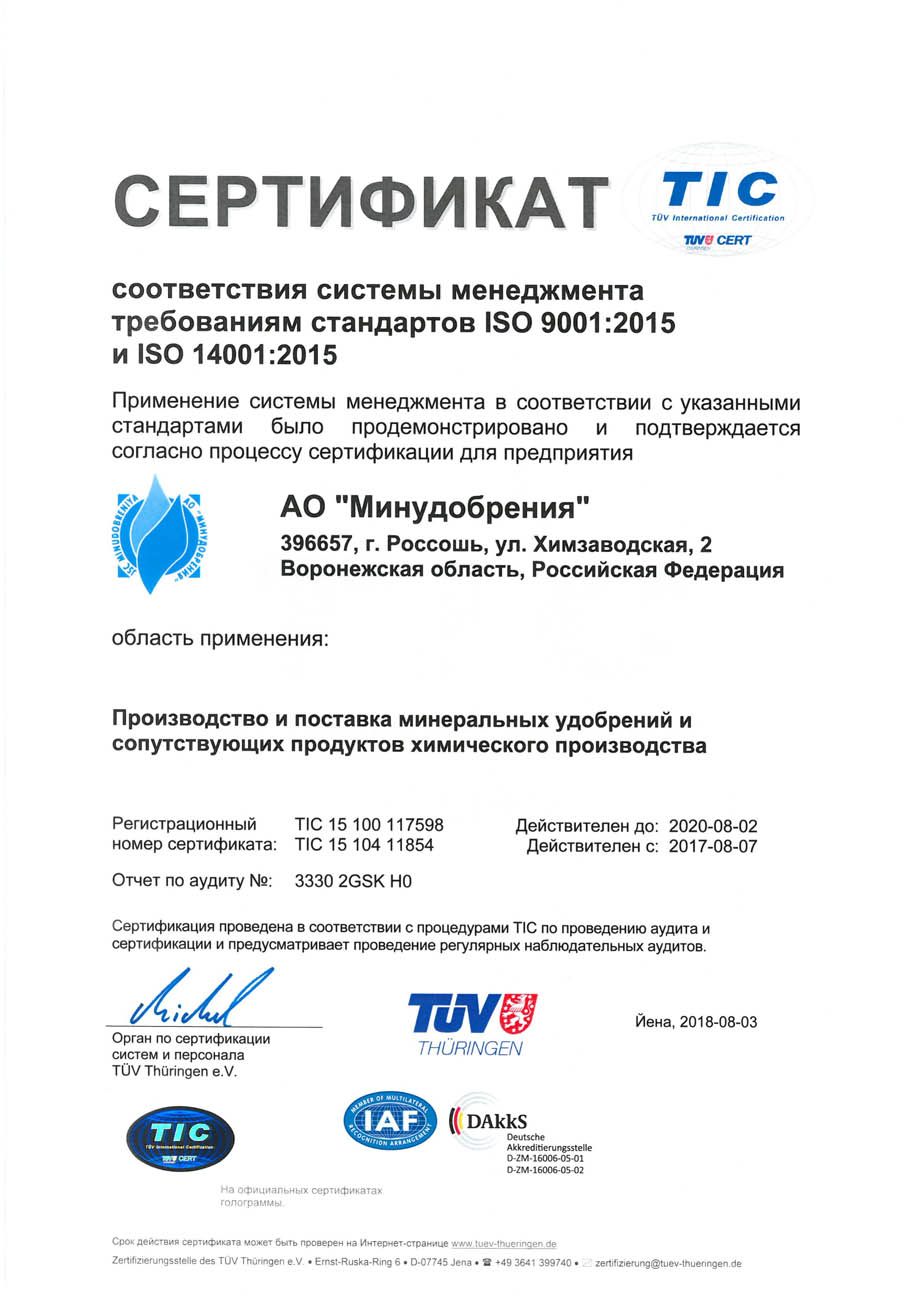 Международный сертификат ISO 9001:2015 и 14001:2015 |
